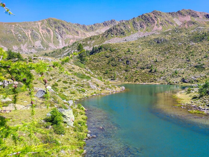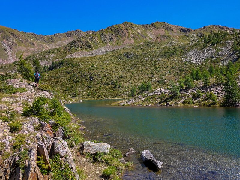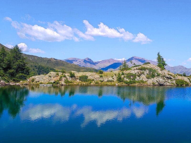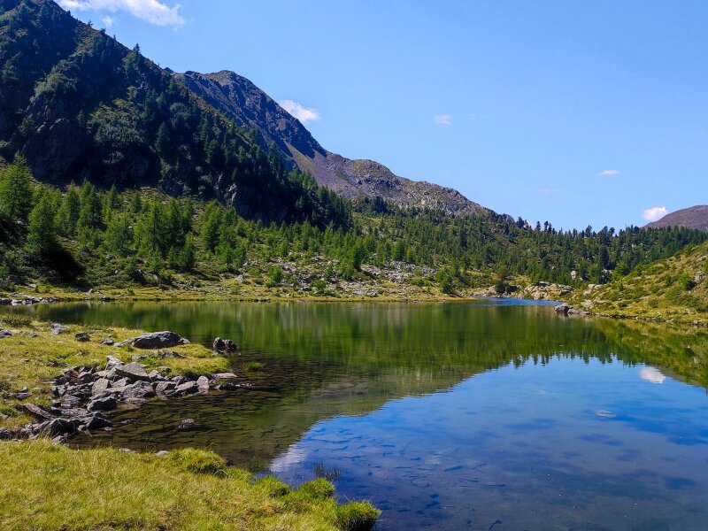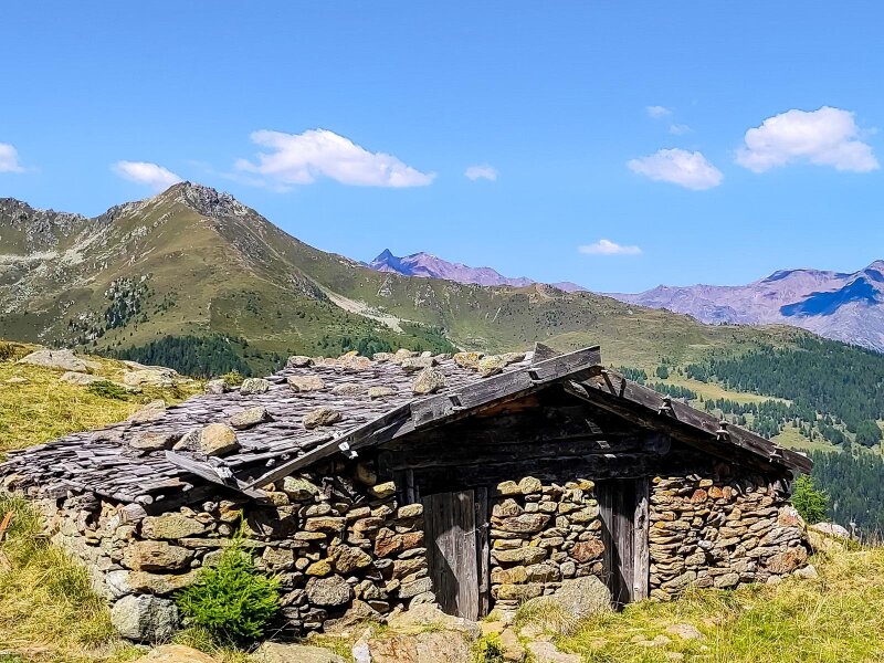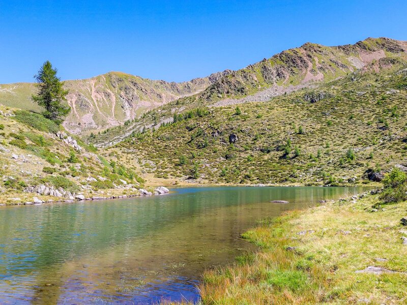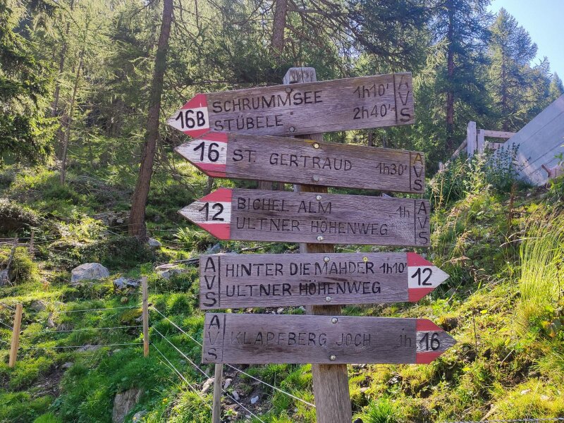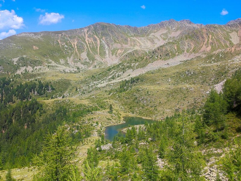 Il percorso si snoda su ghiaia fino a una conca, per poi salire ripidamente verso Malga Binazia, ovvero Schrummalm, una vecchia baita non gestita. Da lì non manca molto. Il piccolo lago alpino è chiamato anche Lago di Clapa e si trova a 2.182 metri di altitudine. È uno dei numerosi specchi d'acqua della Val d'Ultimo. Circondato da un tranquillo paesaggio montano, il lago ha una forma piuttosto allungata. Chi ha ancora energia a sufficienza per un'altra ora e mezza di cammino, da qui può salire sulla cima dello Stubele (2.671 m s.l.m.).