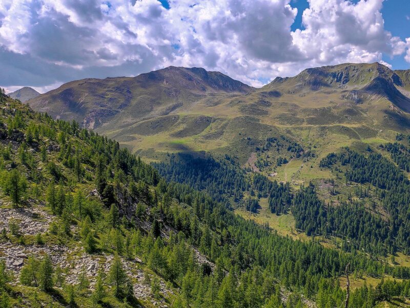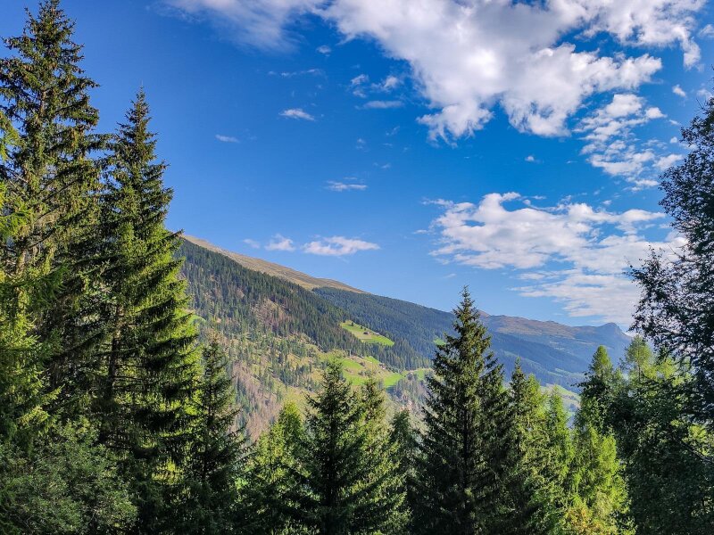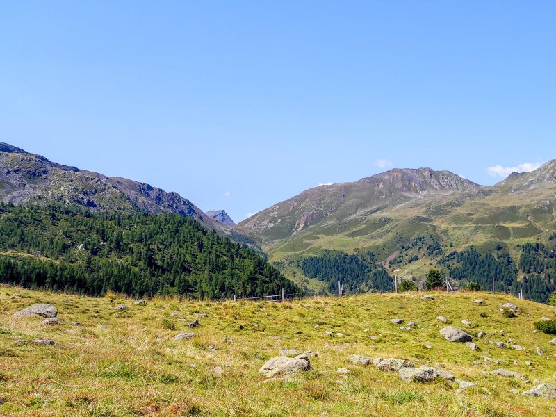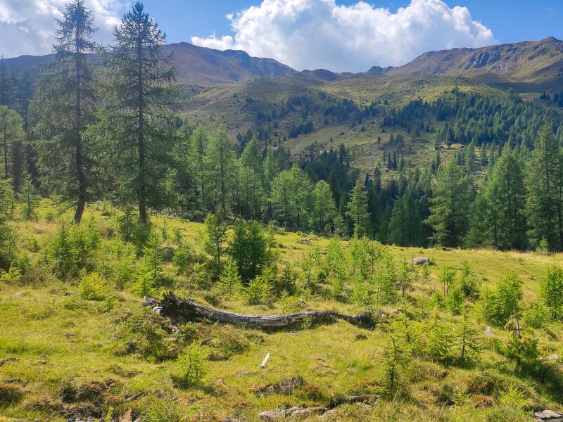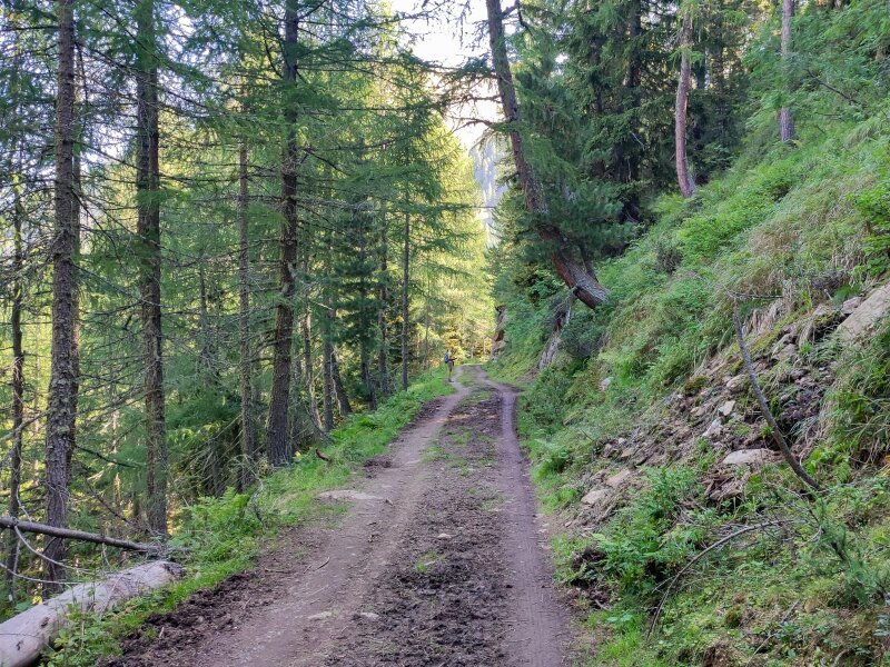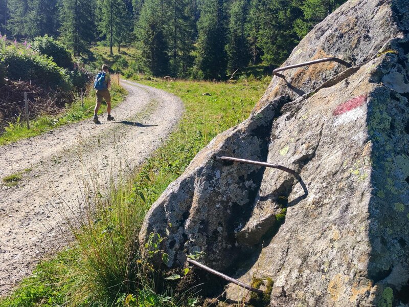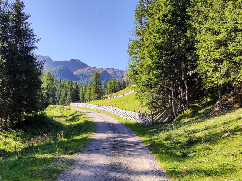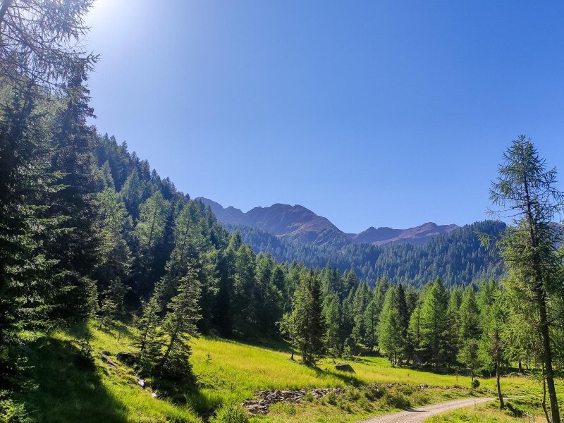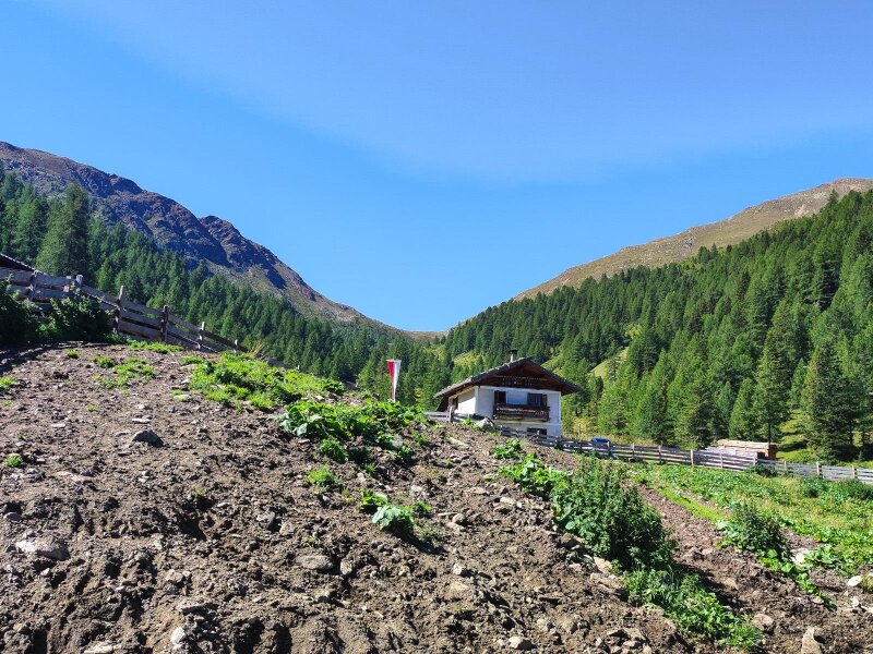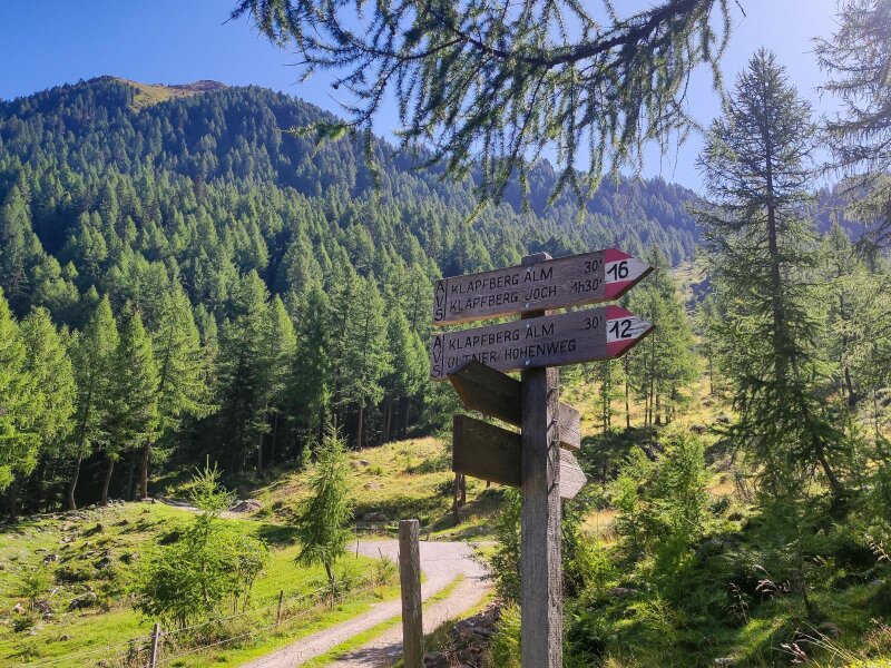Dal parcheggio torniamo indietro per circa 50 metri lungo la strada, per poi imboccare il sentiero n. 16 in direzione della Val di Clapa (Klapfbergtal). All'inizio il sentiero sale dolcemente, ma poi diventa sempre più ripido fino a raggiungere, dopo circa un'ora e mezza, Malga Klapfberg. Qui teniamo la sinistra e seguiamo il sentiero n. 16B in direzione del Lago Binazia (Schrummsee).