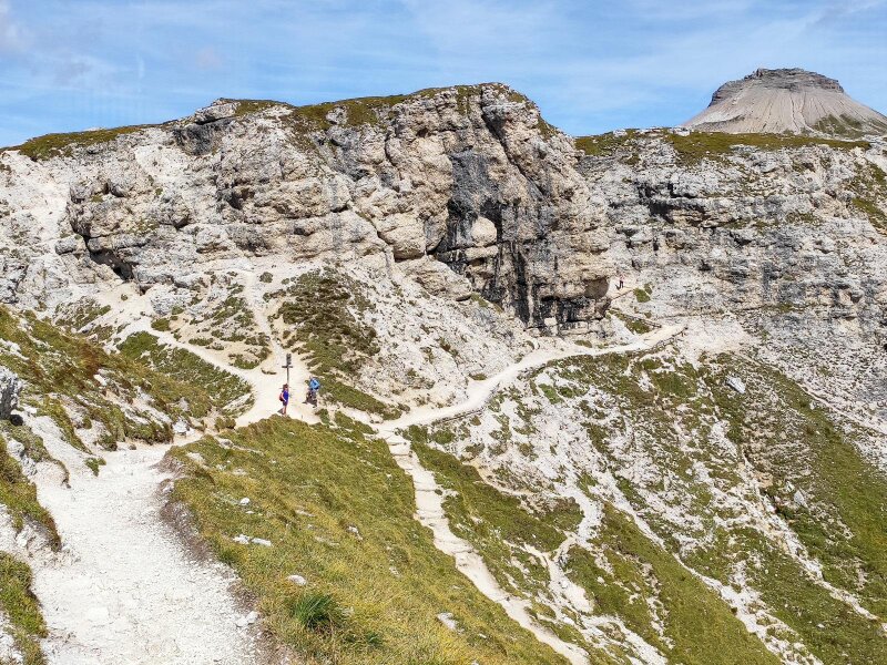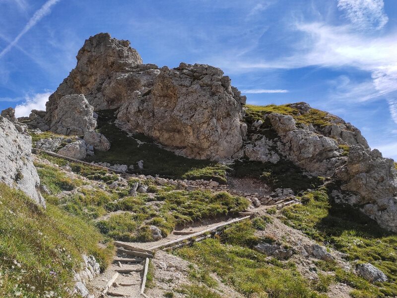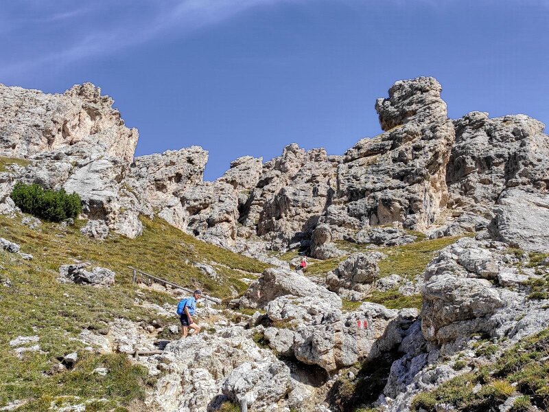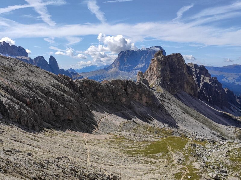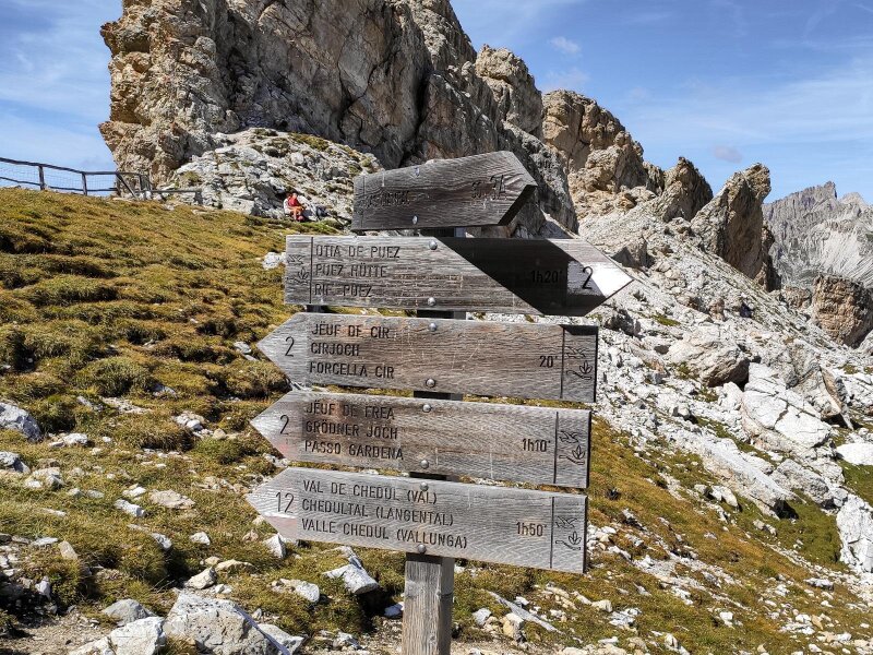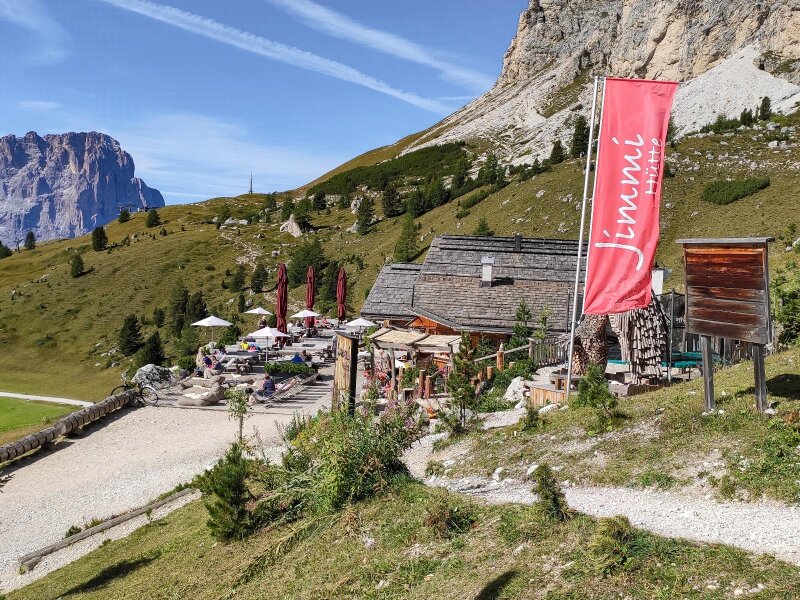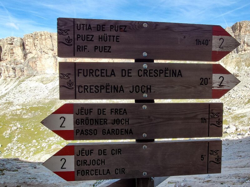 Arrivati, siamo subito colpiti dalla vista sull'imponente Sassolungo, che sulla destra lascia il posto all'Alpe di Siusi. Sopra di noi si ergono le cime del Gruppo del Cir. Il sentiero ci porta prima al Rifugio Jimmi, da dove ci immettiamo sul percorso principale della nostra escursione, l'Alta Via delle Dolomiti n. 2. Questo sale con ripidi tornanti fino a Passo Cir, a 2.465 metri di quota. Segue poi una leggera discesa nella Val Chedul e la salita al secondo valico, Passo Crespëina.