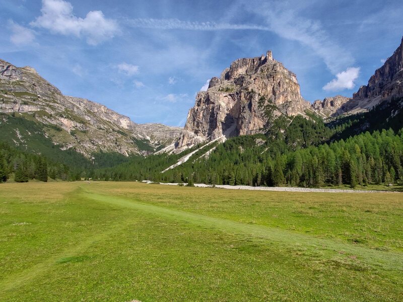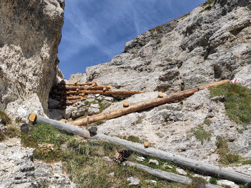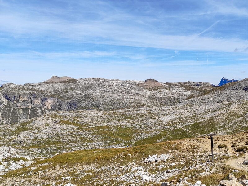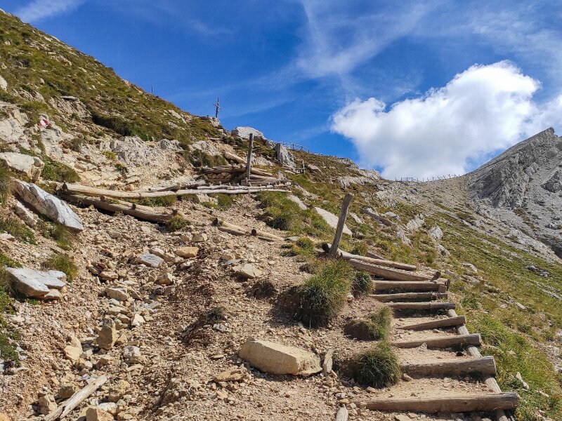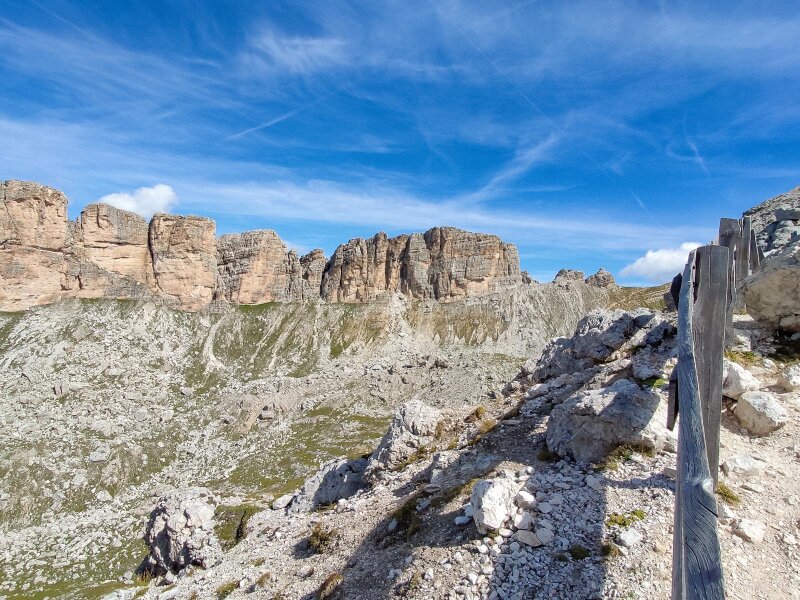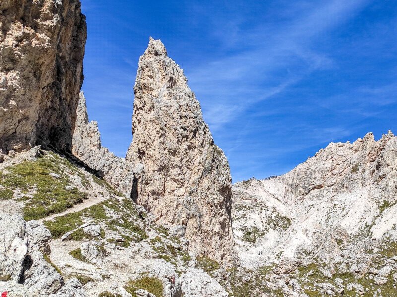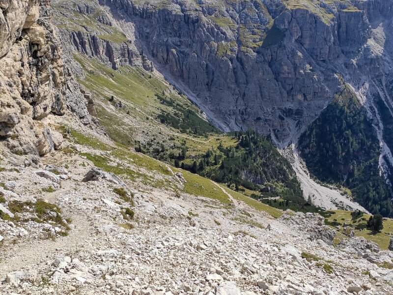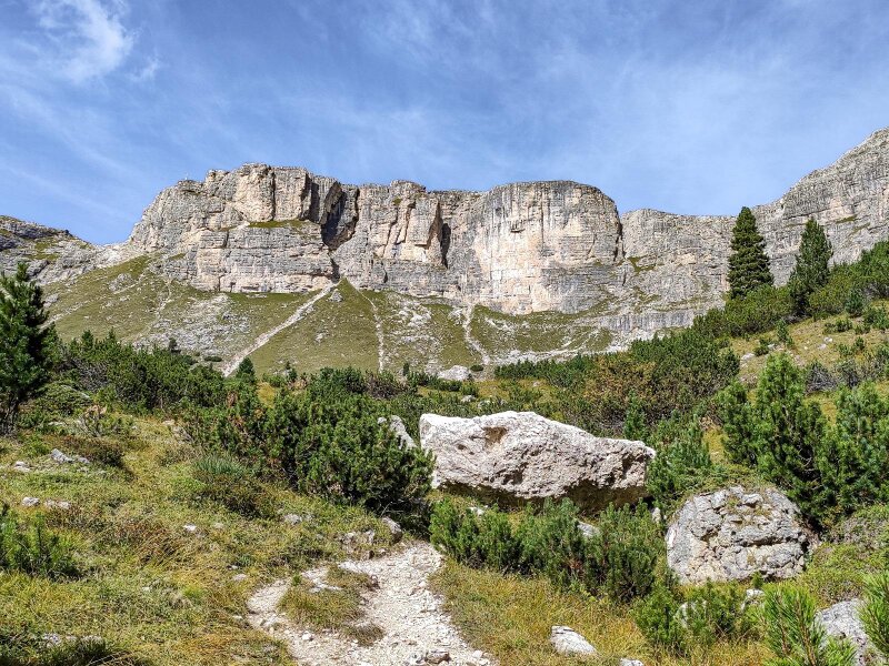 Arrivati, siamo subito colpiti dalla vista sull'imponente Sassolungo, che sulla destra lascia il posto all'Alpe di Siusi. Sopra di noi si ergono le cime del Gruppo del Cir. Il sentiero ci porta prima al Rifugio Jimmi, da dove ci immettiamo sul percorso principale della nostra escursione, l'Alta Via delle Dolomiti n. 2. Questo sale con ripidi tornanti fino a Passo Cir, a 2.465 metri di quota. Segue poi una leggera discesa nella Val Chedul e la salita al secondo valico, Passo Crespëina.
