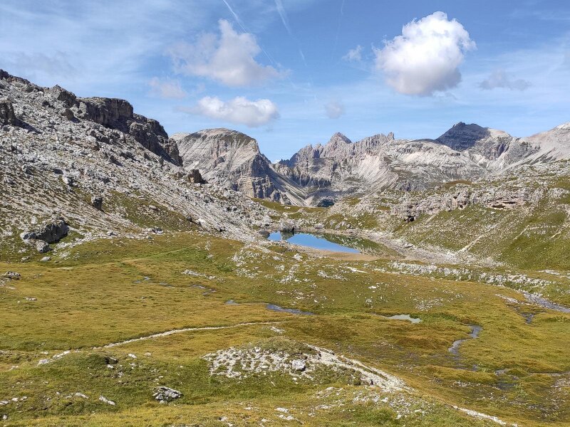 Superato il passo, che con i suoi 2.531 metri rappresenta il punto più alto della nostra escursione, raggiungiamo l'altipiano del Puez, un paesaggio davvero unico. Il luogo ideale per una breve pausa! Per arrivare al Rifugio Puez ci mancano ancora 80 minuti di cammino. Costeggiando il Lago di Crespëina, adagiato in una conca, e seguendo sempre il segnavia numero 2, raggiungiamo in breve la Forcella di Ciampei a 2.359 metri di quota. A proposito, il piccolo lago alpino gardenese è conosciuto qui con il nome ladino di Lech de Crespëina.