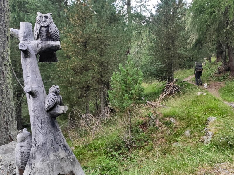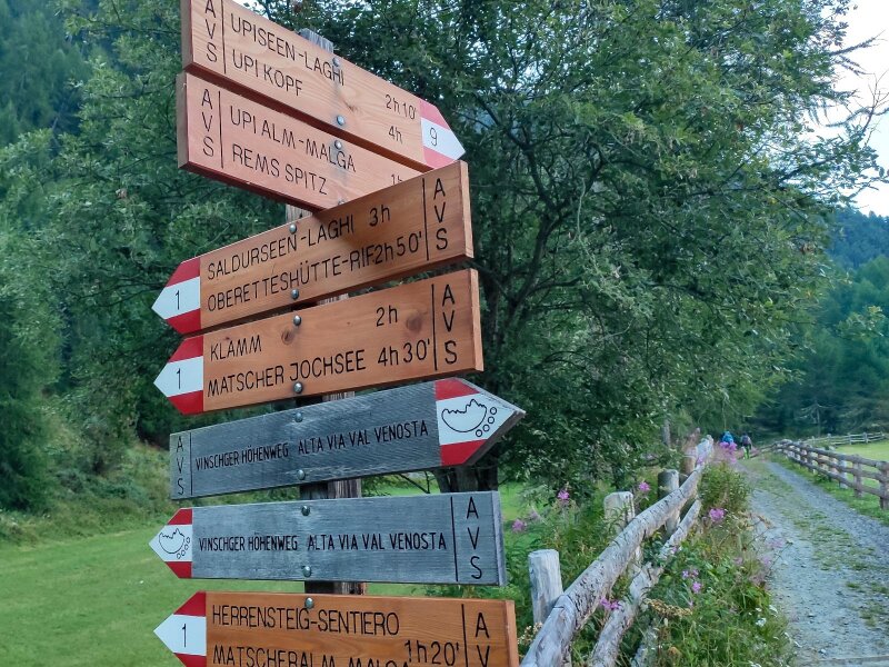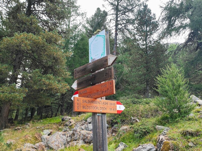 Questa impegnativa escursione in montagna in Val Venosta ci porta ai magnifici Laghi di Saldura e al Rifugio Oberettes. Il percorso inizia al maso Glieshof, alla fine della Val di Mazia, dove si trova il certificato "Villaggio degli Alpinisti" di Mazia. Il Glieshof stesso è un noto punto di partenza per le escursioni. Lì ha inizio il sentiero n. 1 in direzione dei Laghi di Saldura (Saldurseen). Si sale attraverso il bosco fino a una radura con una recinzione in legno, panchine e una fontana. Dopo 40 minuti di cammino, proseguiamo per altri dieci minuti fino all'incrocio con il sentiero n. 4.
