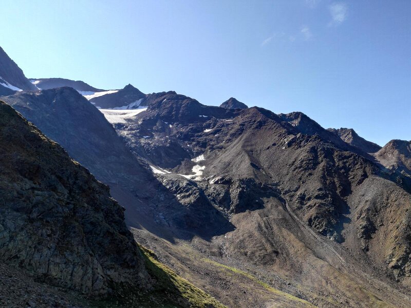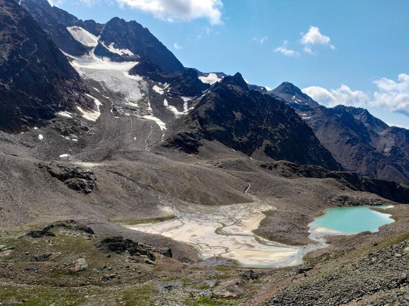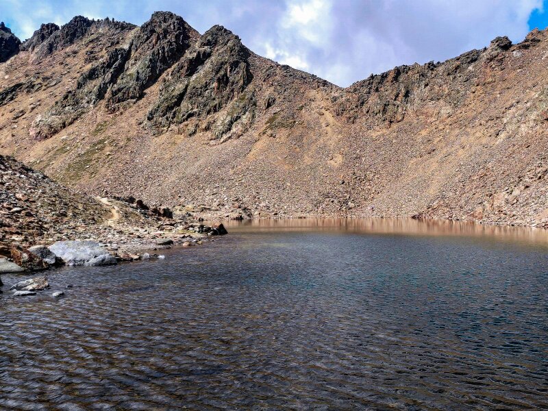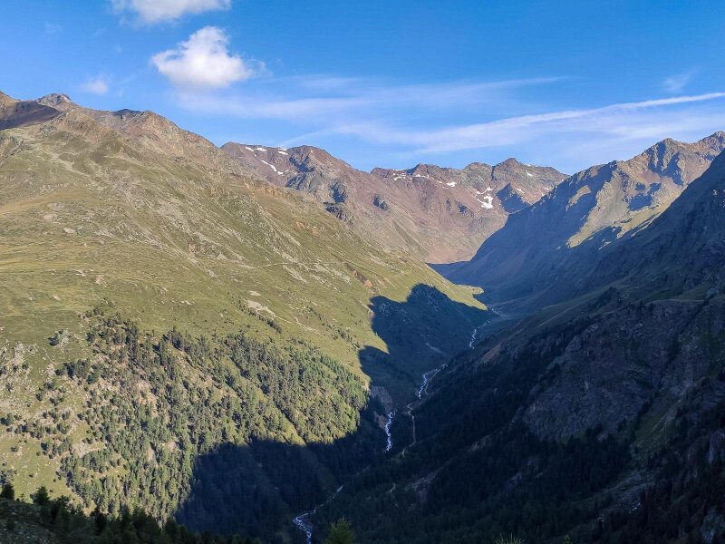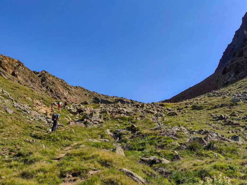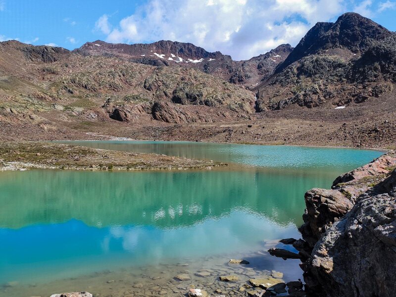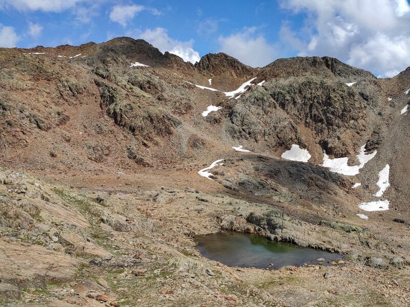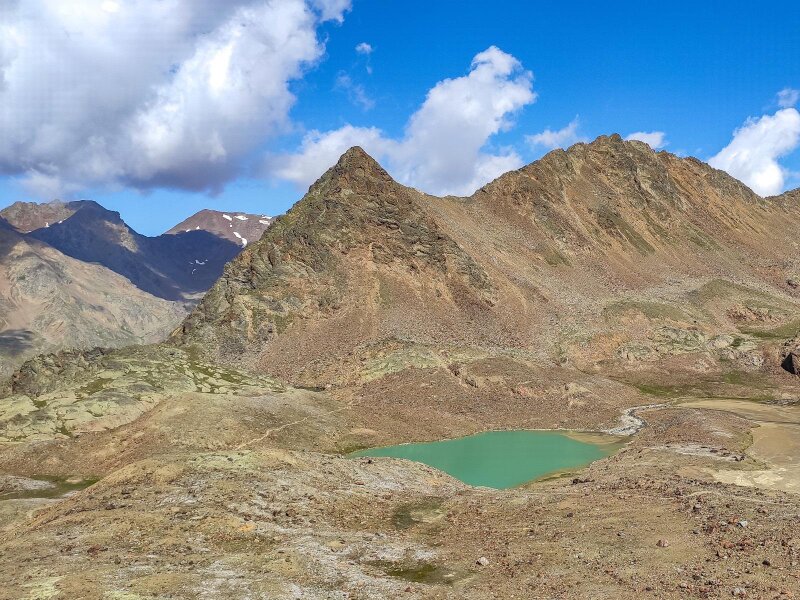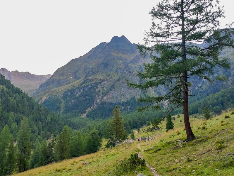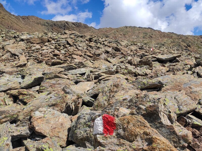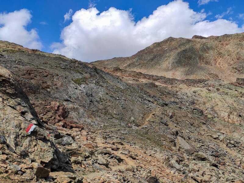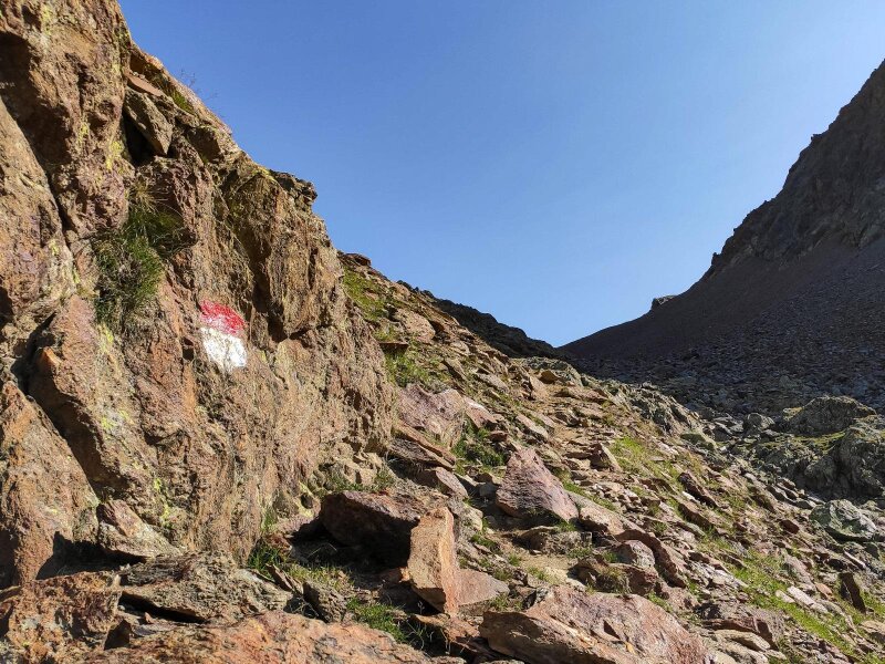 Dal Fischersee proseguiamo in salita seguendo i segnavia bianco-rossi: dopo 20 minuti, sulla destra appaiono altri due laghi. Il lago successivo è di forma più allungata. Dalla sponda saliamo a sinistra sinistra fino al bivio, dove si ricollega il sentiero n. 1. Questo conduce alla Forcella del Santo, il punto più alto della nostra escursione (3.097 m s.l.m.). La discesa dal passo è ripida e alcuni tratti sono attrezzati con corde fisse. Sono necessari passo sicuro e assenza di vertigini!