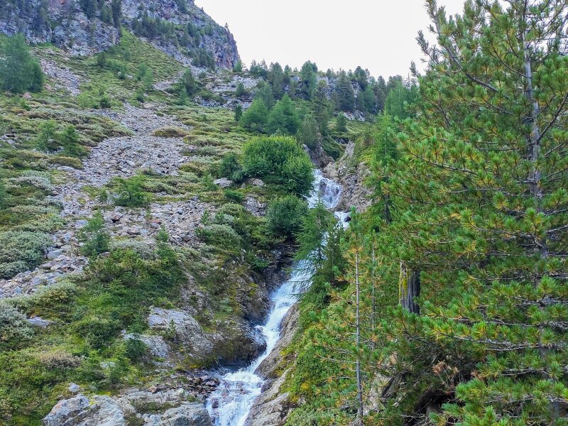 Qui l'escursione diventa più faticosa, poiché il sentiero sale più ripido. Passiamo accanto a un torrente di montagna e a delle cascate, raggiungendo infine un pianoro e una sella. Qui si intravede già il primo lago: più in là scorgiamo gli altri Laghi di Saldura.