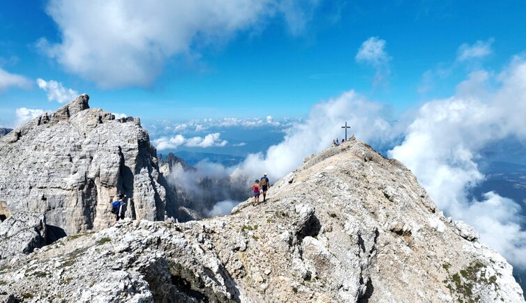 Segue l'ultima parte attraverso terreno roccioso ed esposto: tratti di arrampicata non assicurati fino alla vetta. Accanto alla croce di vetta ci fermiamo, il mondo ai nostri piedi. I chiari calcari di scogliera dell'antico mare primordiale, che costituiscono il Latemar, sono attraversati da striature scure di roccia vulcanica. Si possono ammirare le Dolomiti con la Catena del Lagorai e le Pale di San Martino, la Marmolada - la cima più alta delle Dolomiti -, il leggendario Catinaccio e lo Sciliar. Il ritorno avviene lungo lo stesso percorso. Si prega di evitare il tour in caso di pioggia o ghiaccio!
