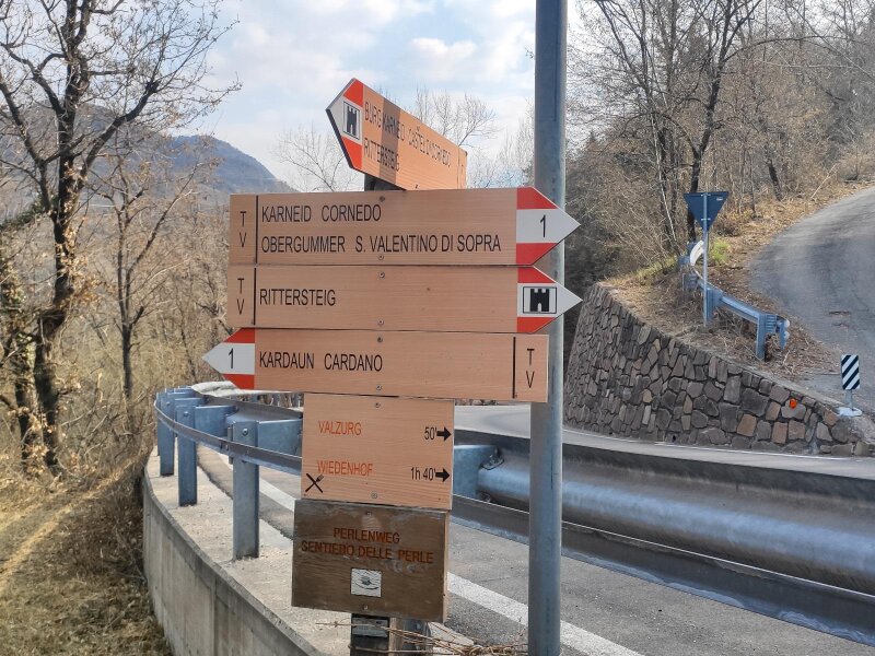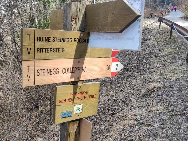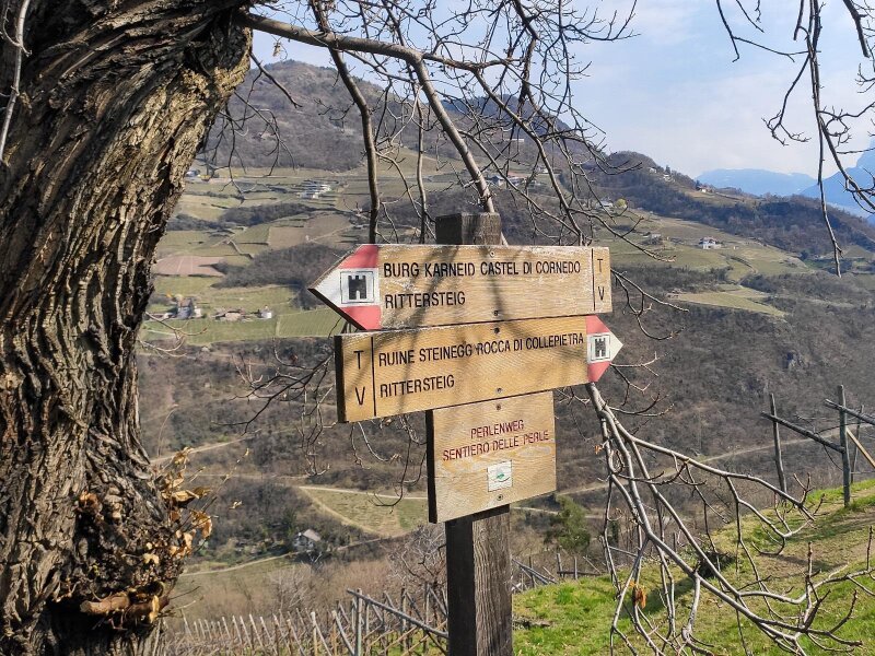 Noi scegliamo di percorrere la prima tappa del tour, che ci porta da Cardano presso Bolzano fino a Collepietra. In realtà, la prima tappa terminerebbe a Tires al Catinaccio, ma noi la accorciamo un po'. Partiamo da Cardano - facilmente raggiungibile con i mezzi pubblici - e seguiamo le indicazioni "Cornedo/Sentiero delle Perle", in parte su strada asfaltata e in parte su sterrato. Dopo circa 40 minuti raggiungiamo Cornedo all'Isarco, circondato da vigneti dove si produce il vino della Valle Isarco. A questo punto ci addentriamo nel bosco, camminando verso le rovine di Collepietra.