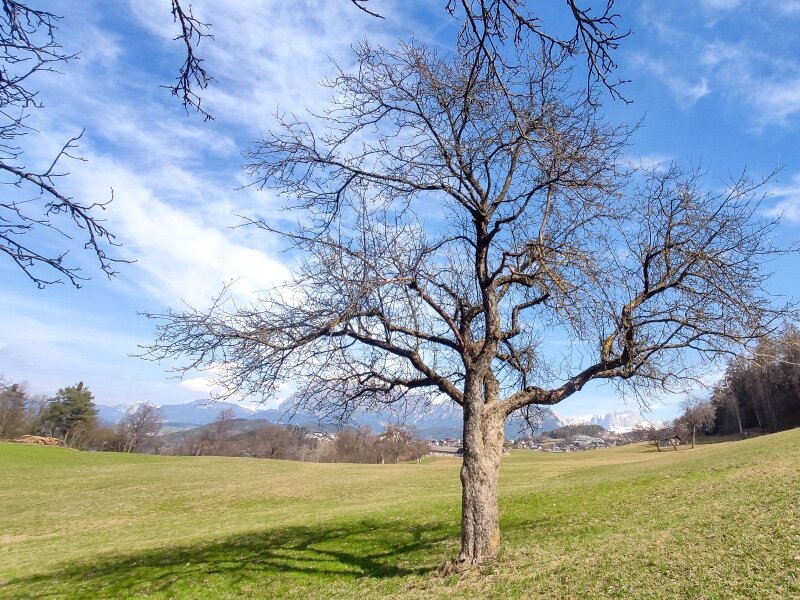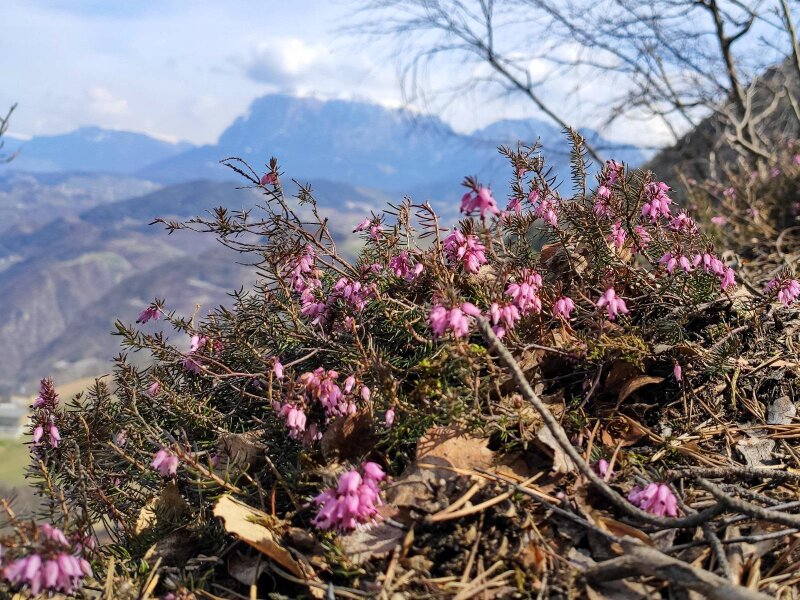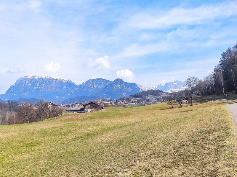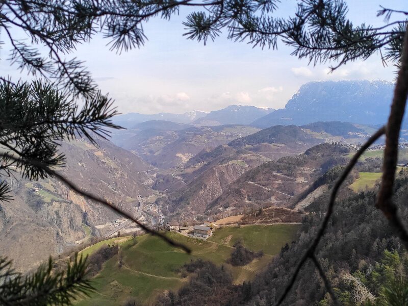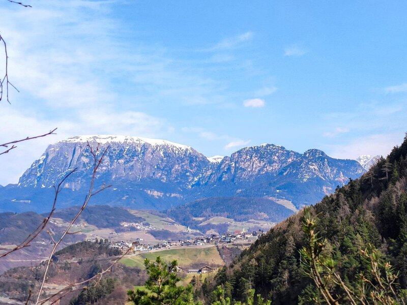 Le rovine del Castello di Collepietra, di cui restano solo alcuni resti delle mura, sono uno dei pochi complessi castellani doppi (residenza e fortezza) dell'Alto Adige e risalgono al XII e XIII secolo. Seguiamo il sentiero nel bosco in costante salita - i primi fiori primaverili fanno capolino dalla terra. Dopo due ore e mezza raggiungiamo un pianoro con un punto panoramico a 750 metri di altitudine. Tra gli alberi si intravedono l'imponente Sciliar e il paese di montagna di Collepietra.