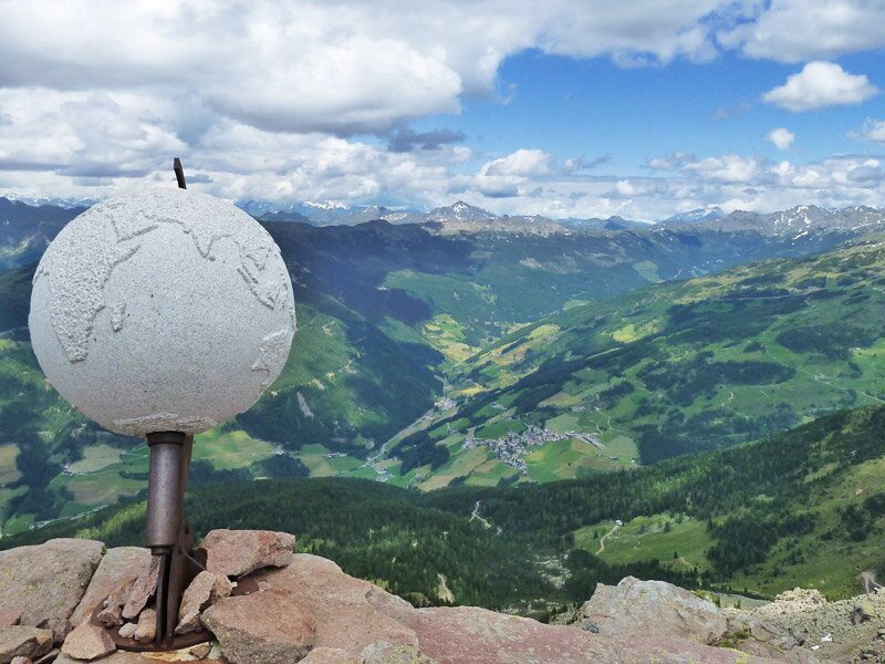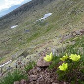 Ammiriamo i colori di primule di montagna, anemoni, rododendri e genziane, immersi in un silenzio rotto solo dai richiami di marmotte e ermellini e dal canto di uccelli come il culbianco. Il plateau sommitale è disseminato di pozze d’acqua in cui si specchia l'azzurro del cielo. Giunti alla croce di vetta, la vista si apre sulla sottostante Val Sarentino e sulla località di San Martino/Reinswald. Procediamo verso sud, in direzione della seconda cima del giorno, la poco distante Forcella Sarentina. Il cielo parzialmente coperto non ci impedisce di godere di una vista a 360° che va dalle cime dallo spartiacque alpino fino al Monte Baldo sul Lago di Garda.