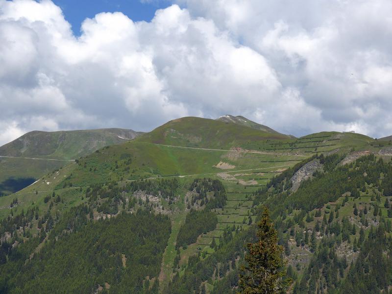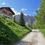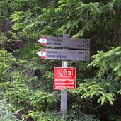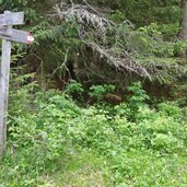 Qui intraprendiamo il sentiero forestale n. 12 al Rifugio Genziana. Dopo le prime curve non si sente più il rumore del traffico sull'autostrada e ci ritroviamo immersi in verdi boschi. A ca. 1.620 m di altitudine a destra parte il sentiero n. 11, che seguiamo. Tratti pianeggianti si alternano alle salite, infine il sentiero si allarga e diventa carreggiabile. Le prime baite nel bosco ci fanno intuire che ci avviciniamo alla nostra meta. Tutto ad un tratto il bosco finisce e si apre un paesaggio di prati alpini: sono i prati della Malga Leitneralm, che si estendono quasi fino alle Cime Vallaccia.