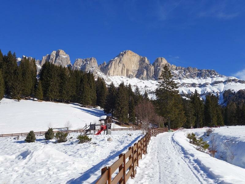 Si continua attraverso il bosco, seguendo il sentiero n. 9, fino a Via Nigra. Sopra le nostre teste le cime del Gruppo del Catinaccio si innalzano verso il cielo. Alla fermata dell'autobus il sentiero si dirama verso il Sasso dell'Imperatore (Kaiserstein, circa 5 minuti) e verso la Baita Masaré.