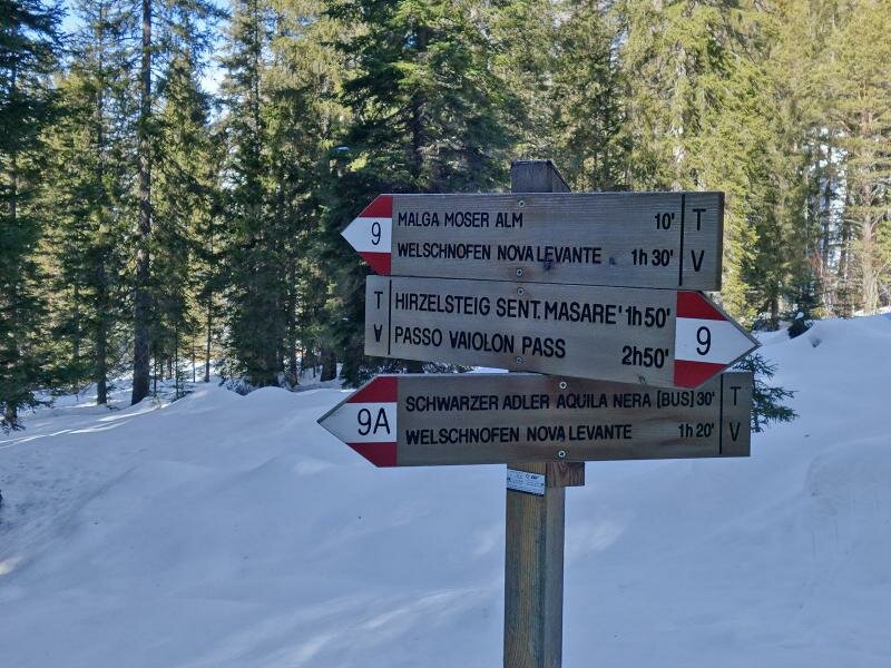 Questa piccola escursione con le ciaspole inizia sopra Nova Levante a Carezza, poco prima della curva sulla strada per il Passo di Costalunga (Karerpass) presso l'Hotel Adler. Il sentiero n. 9 parte un po' ripido, poi lungo la vallata fino all'Hotel Moseralm (possibilità di ristoro) sull'omonima malga diventa più facile. Qui si incontrano alcune piste della Ski Area Carezza Dolomites.