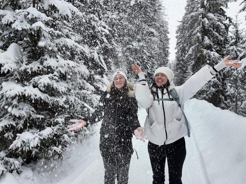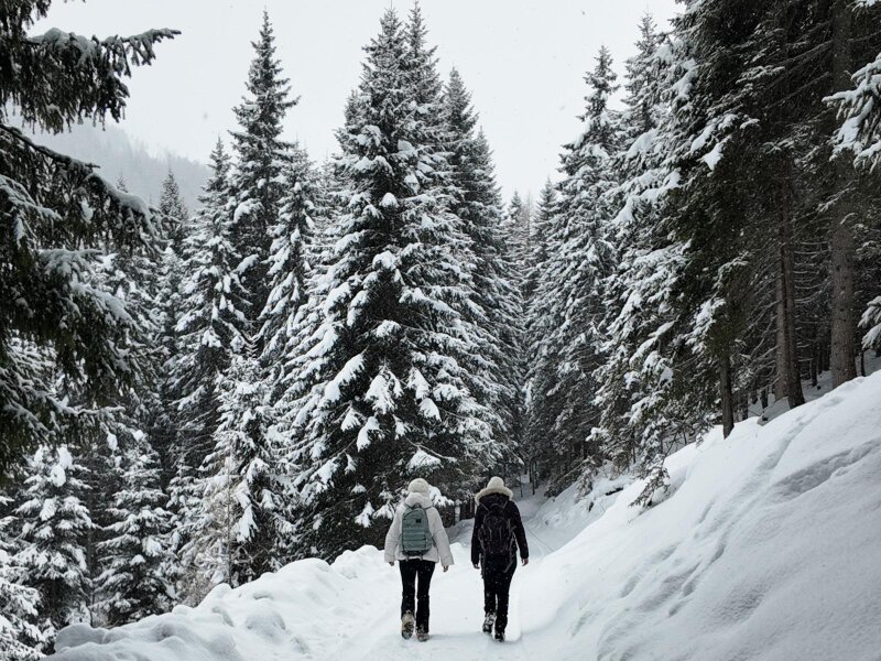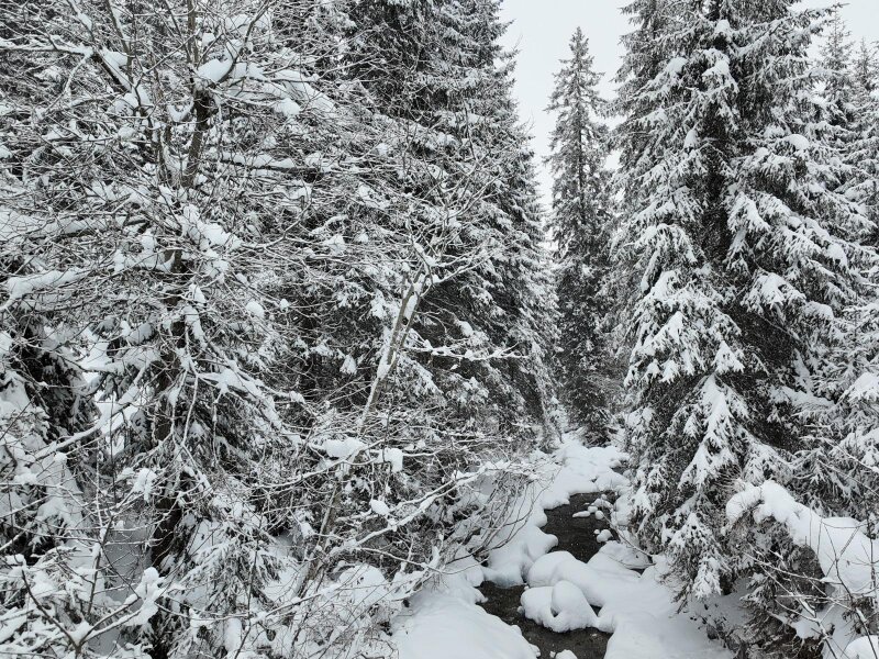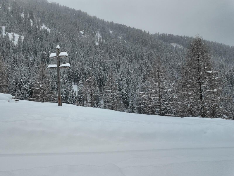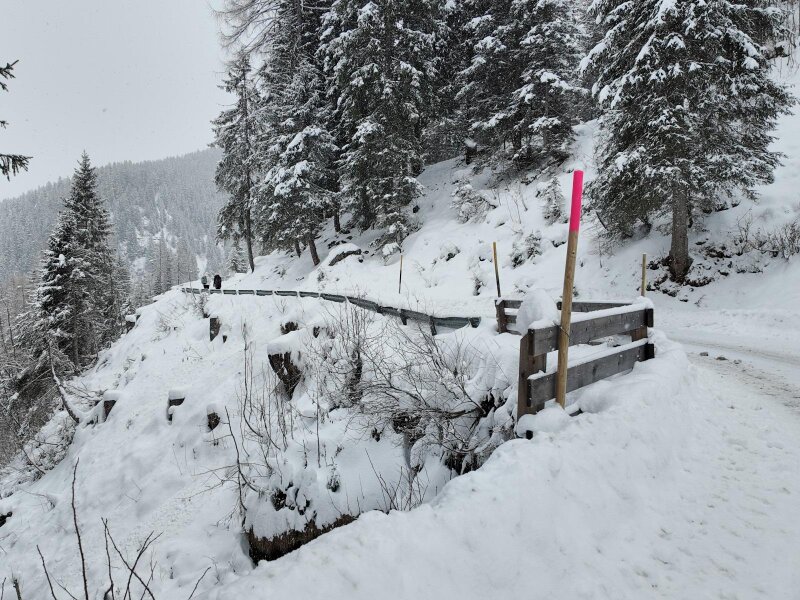 Partiamo dal parcheggio "Kratzegg" a Ulfas e vediamo subito il cartello che ci indica la via per la malga. Si tratta del sentiero n. 2A - dato che l'escursione è breve, rimarremo su questo tracciato. Ci dirigiamo verso nord fino al bosco e poi proseguiamo in moderata salita attraverso la foresta innevata. Avanziamo nella neve fresca e anche qualche palla di neve colpisce il bersaglio. Dopo aver camminato per un po' nella neve, arriviamo a un ponte.
