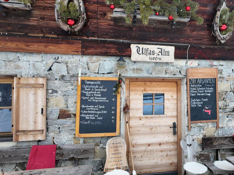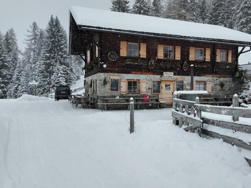 Dopo aver attraversato questo ponticello, teniamo la destra. Con un'ampia curva a sinistra, dopo meno di un'ora, arriviamo in leggera salita alla Malga di Ulfas (Ulfaser Alm). L'incantevole baita si trova a 1.601 metri di altitudine ed è aperta anche in inverno: da dicembre a metà febbraio propone a pranzo ottimi piatti regionali. Delle buone scarpe invernali sono indispensabili per questa passeggiata, mentre il ritorno avviene sullo stesso percorso dell'andata.