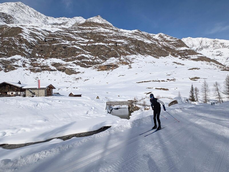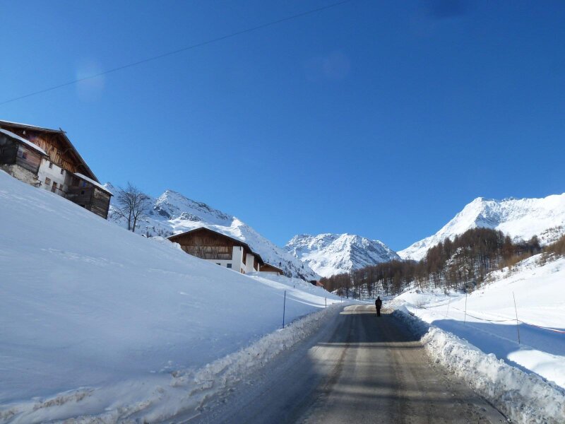Da Moso in Passiria la strada sale fino al parcheggio di Plan, a 1.600 metri di quota. Attorno al centro del paese, chiuso al traffico, si estendono le piste della piccola area sciistica Plan Val Passiria. Noi restiamo invece sul fondovalle e iniziamo la nostra escursione in questa giornata di febbraio imboccando dapprima il sentiero n. 24, che ci porta sul versante soleggiato della valle.