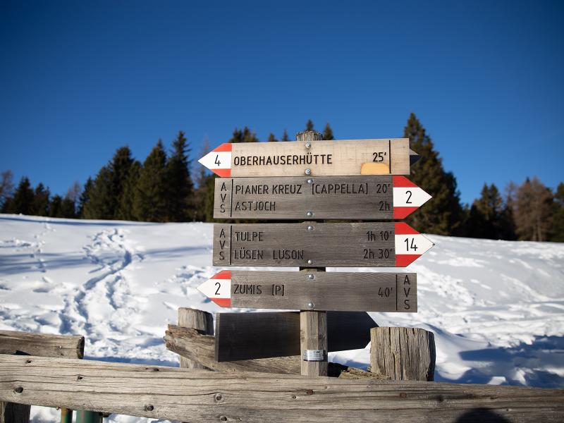 Punto di partenza della nostra escursione invernale è il parcheggio Zumis presso Malga Platzer a 1.719 m s.l.m., raggiungibile sia da Luson paese (Lüsen Dorf) che da Rodengo (Rodeneck). La descrizione del percorso di questa escursione è particolarmente facile: procedere sempre lungo la larga strada forestale n. 2 fino a Malga Roner. In alternativa, si può raggiungere la nostra meta anche attraverso il Sentiero della Creazione (n. 4), che si snoda in parallelo a sinistra attraverso il bosco e mostra alcune opere d'arte relative alla storia biblica della creazione.